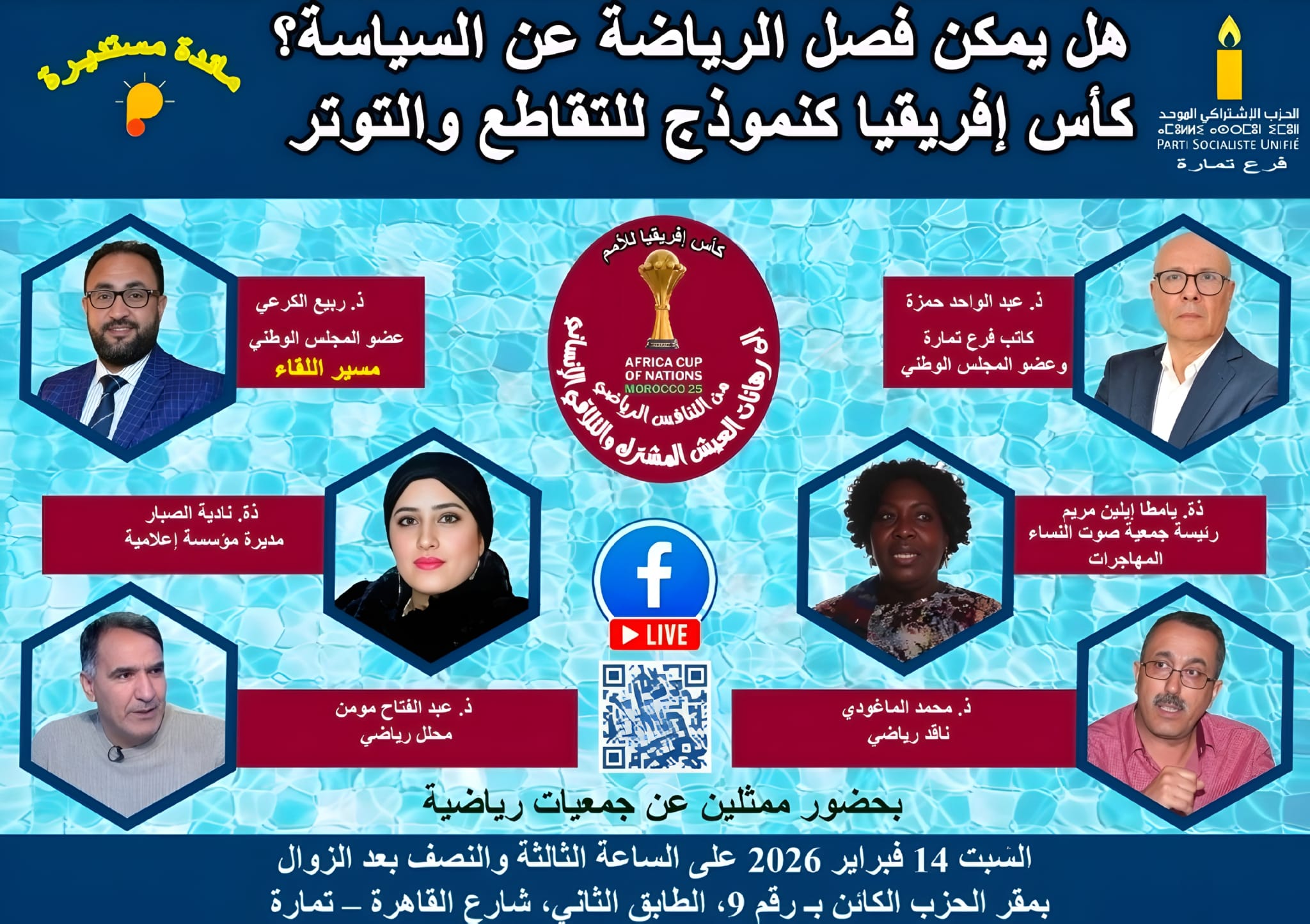 فقد أعلن الفرع المحلي للحزب عن تنظيم مائدة مستديرة فكرية-نقاشية تحت عنوان «هل يمكن فصل الرياضة عن السياسة؟ كأس إفريقيا كنموذج للتقاطع والتوتر»، وذلك يوم السبت 14 فبراير 2026 على الساعة الثالثة والنصف بعد الزوال، بمقر الحزب الكائن برقم 9، الطابق الثاني، شارع القاهرة بمدينة تمارة.